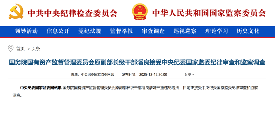 据中纪委网站12月12日晚间消息,国务院国有资产监督管理委员会原副部长级干部潘良涉嫌严重违纪违法,目前正接受中央纪委国家监委纪律审查和监察调查。